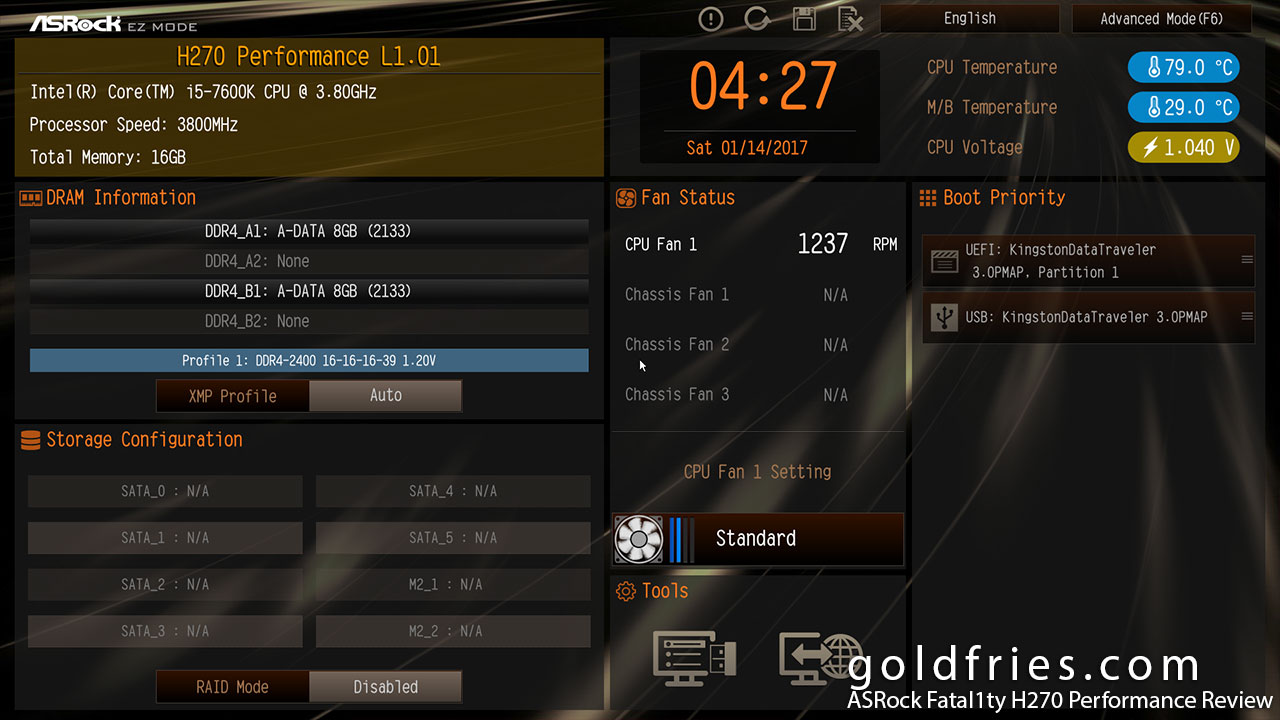 What’s neat about the UEFI here is that you get to overclock the processor, however the overclocking is very limited and the success rate depends on your processor. I’m using an Intel Core i5-7600K and the base speed went from 3.8 to 4Ghz.