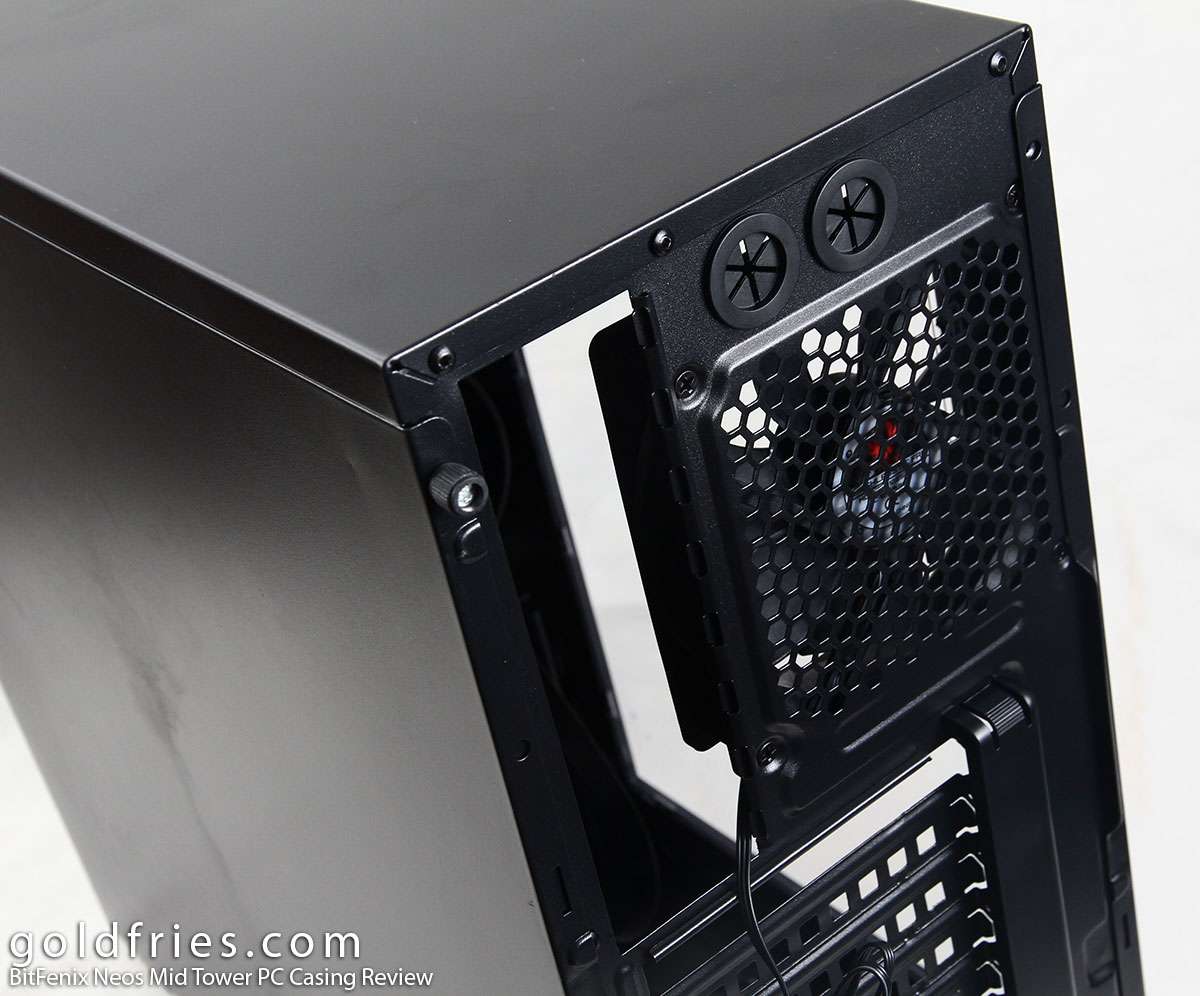 At the back the neos comes bundled with a pre-installed 120mm fan and it has 2 openings for water-cooling tubes.