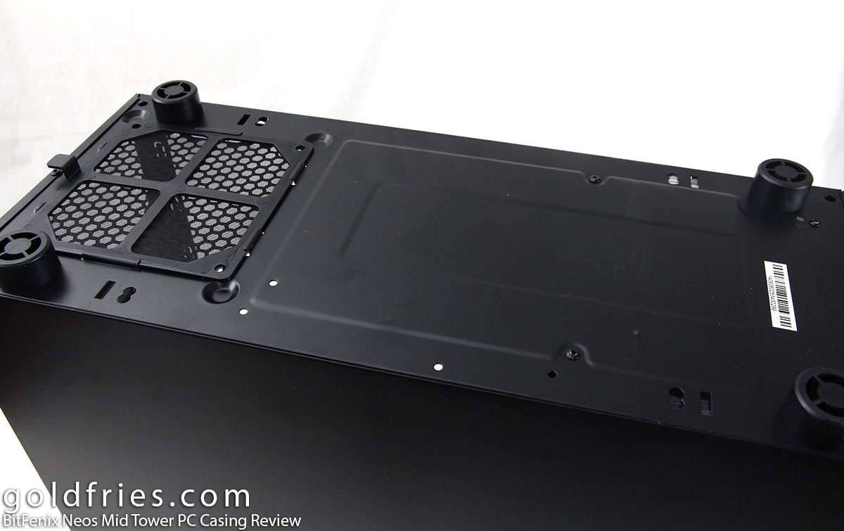 From the bottom, you’ll see 4 rather tall feet and a dust filter for the PSU.